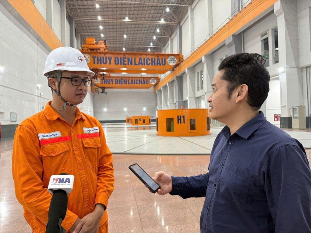 | Anh Nguyễn Văn Tiệp, Quản đốc phân xưởng vận hành Nhà máy Thủy điện Lai Châu (Công ty Thủy điện Sơn La) trao đổi với phóng viên TTXVN |