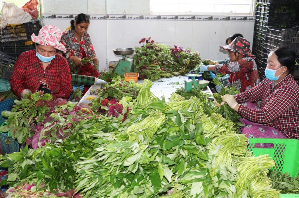 | Người lao động nhàn rỗi tham gia sơ chế rau ở hợp tác xã rau an toàn Hòa Thạnh của huyện Gò Công Tây, tỉnh Tiền Giang. |