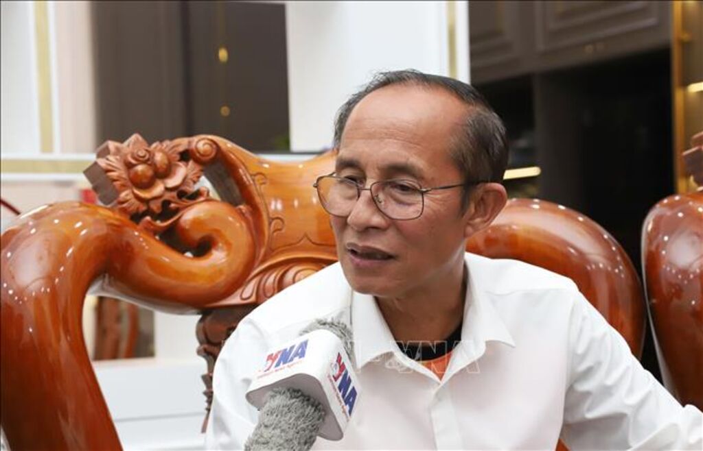 | Ông Nguyễn Văn Hùng, Việt kiều ở tỉnh Khammouane, Trung Lào, trả lời phỏng vấn. Ảnh: Xuân Tú - PV TTXVN tại Lào |