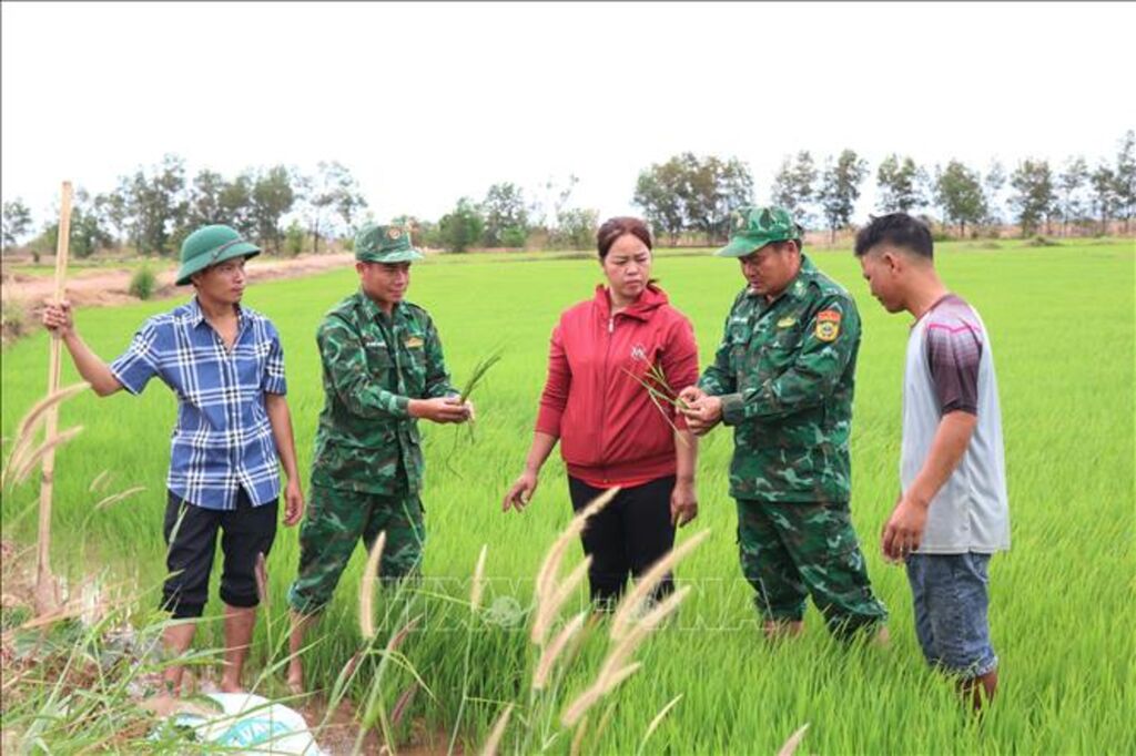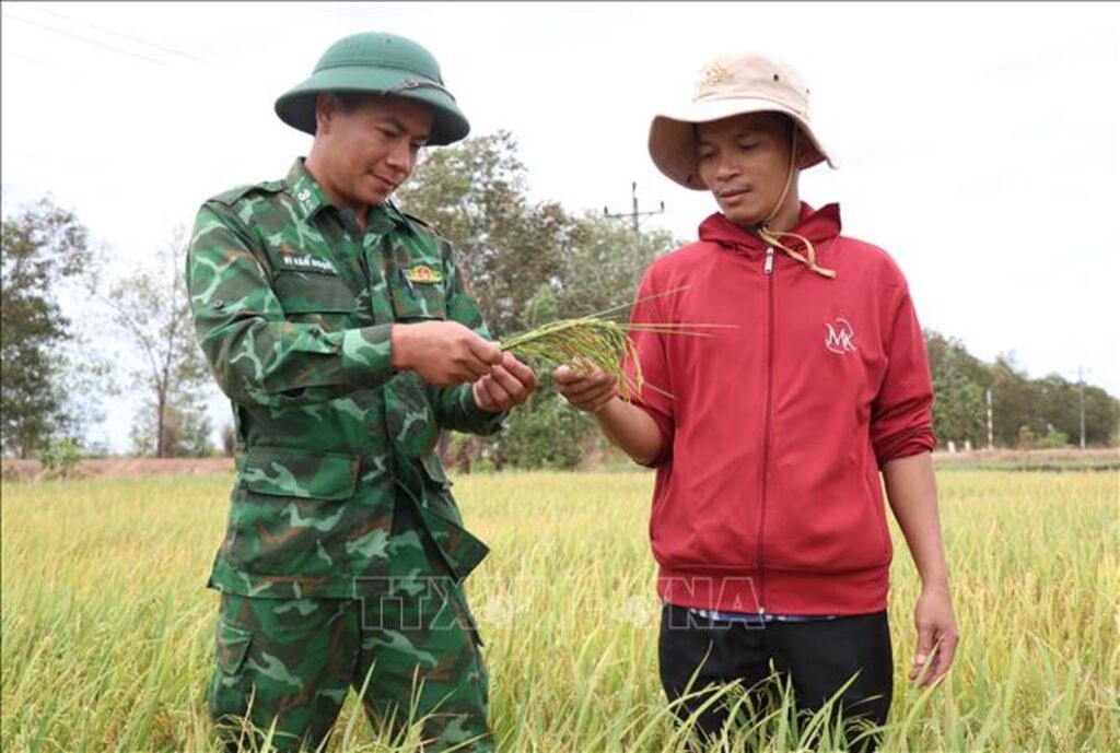 | Chiến sĩ Đồn Biên phòng Ea H’leo cùng nông dân xã Ia Lốp thăm đồng, kiểm tra sinh trưởng của cây lúa. |