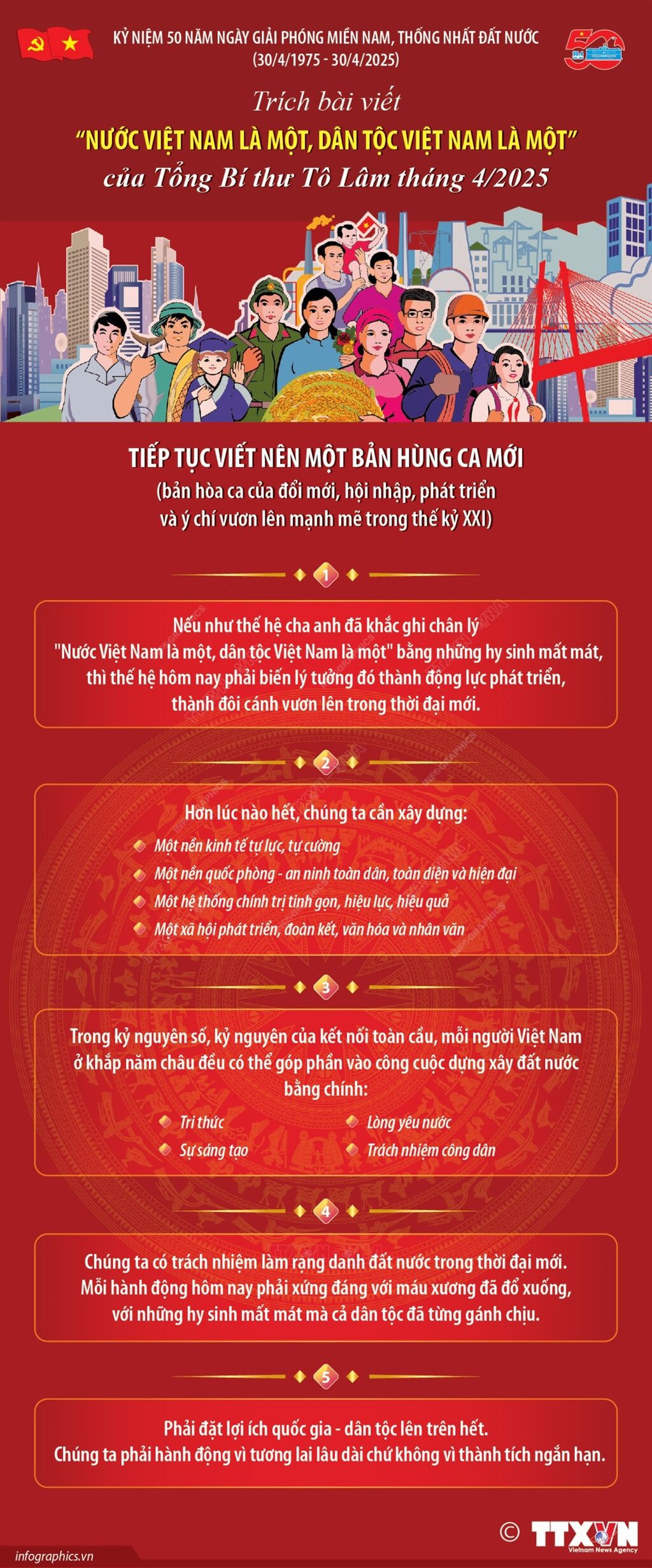 Nhân dịp kỷ niệm 50 năm Ngày Giải phóng miền Nam, thống nhất đất nước (30/4/1975 - 30/4/2025), đồng chí Tô Lâm, Tổng Bí thư Ban Chấp hành Trung ương Đảng Cộng sản Việt Nam, đã có bài viết: "Nước Việt Nam là một, dân tộc Việt Nam là một". Trong bài viết, Tổng Bí thư Tô Lâm khẳng định: Cách đây 50 năm, dân tộc Việt Nam đã viết nên một bản anh hùng ca chói lọi bằng ý chí sắt đá và bản lĩnh kiên cường - đó là bản hòa ca của ý chí, quyết tâm, thống nhất và hòa bình. Nửa thế kỷ sau, chính dân tộc ấy đang tiếp tục viết nên một bản hùng ca mới - bản hòa ca của đổi mới, hội nhập, phát triển và ý chí vươn lên mạnh mẽ trong thế kỷ XXI.