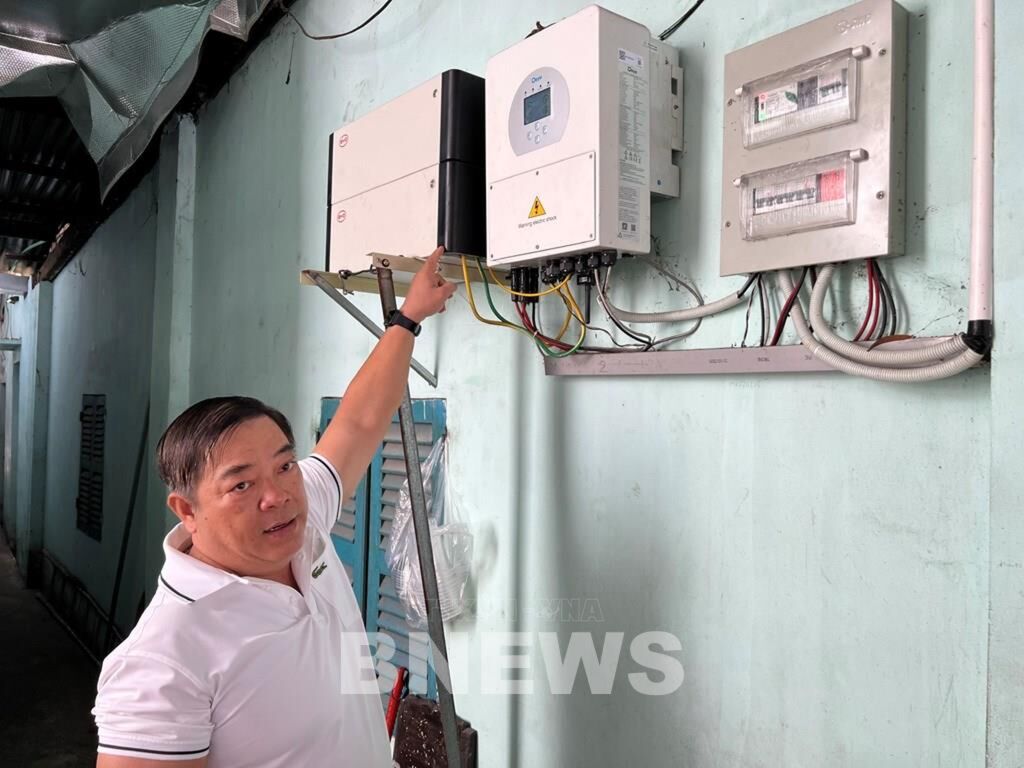 | Anh Nguyễn Minh Hiếu ở Tây Ninh giới thiệu thiết bị tiết kiệm điện tại khu vực phòng trọ. Ảnh: Vân Anh/TTXVN |