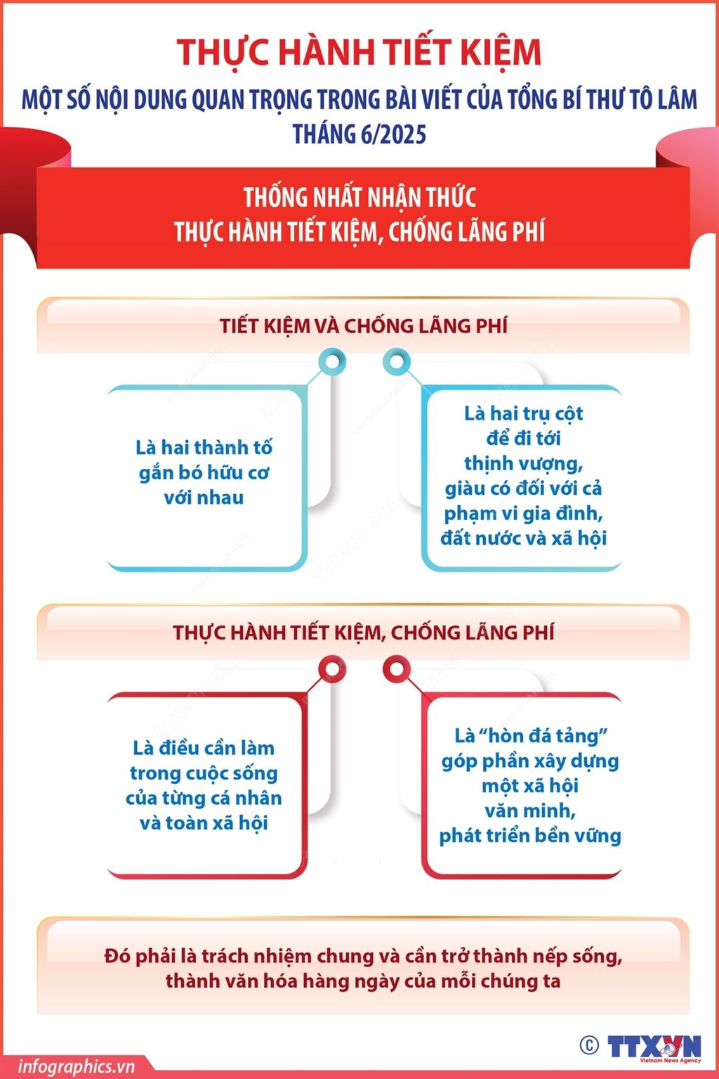 Trong bài viết “Thực hành tiết kiệm” viết ngày 1/6/2025, Tổng Bí thư Tô Lâm nhấn mạnh cần tập trung thực hiện tốt vấn đề: Thống nhất nhận thức, thực hành tiết kiệm, chống lãng phí là một trong những giải pháp căn cơ nhất để đất nước vượt qua mọi bão giông trong bối cảnh tình hình quốc tế có nhiều biến động, tác động trực tiếp, nhiều mặt đến phát triển kinh tế- xã hội và bảo đảm an sinh. Mọi công dân và các cơ quan, đơn vị, tổ chức, doanh nghiệp cần có kế hoạch cụ thể, thực hiện thu-chi hợp lý; cán bộ, đảng viên, nhất là cán bộ lãnh đạo, quản lý phải gương mẫu, vận động gia đình, nhân dân tích cực tham gia; mọi ngành, mọi nghề, mọi nhà, mọi người đẩy mạnh sản xuất, kinh doanh, nâng cao năng suất, chất lượng và hiệu quả lao động sản xuất, triệt để thực hành tiết kiệm, hạn chế tới mức thấp nhất sự lãng phí cả về thời gian, tiền bạc, của cải, sức lực.