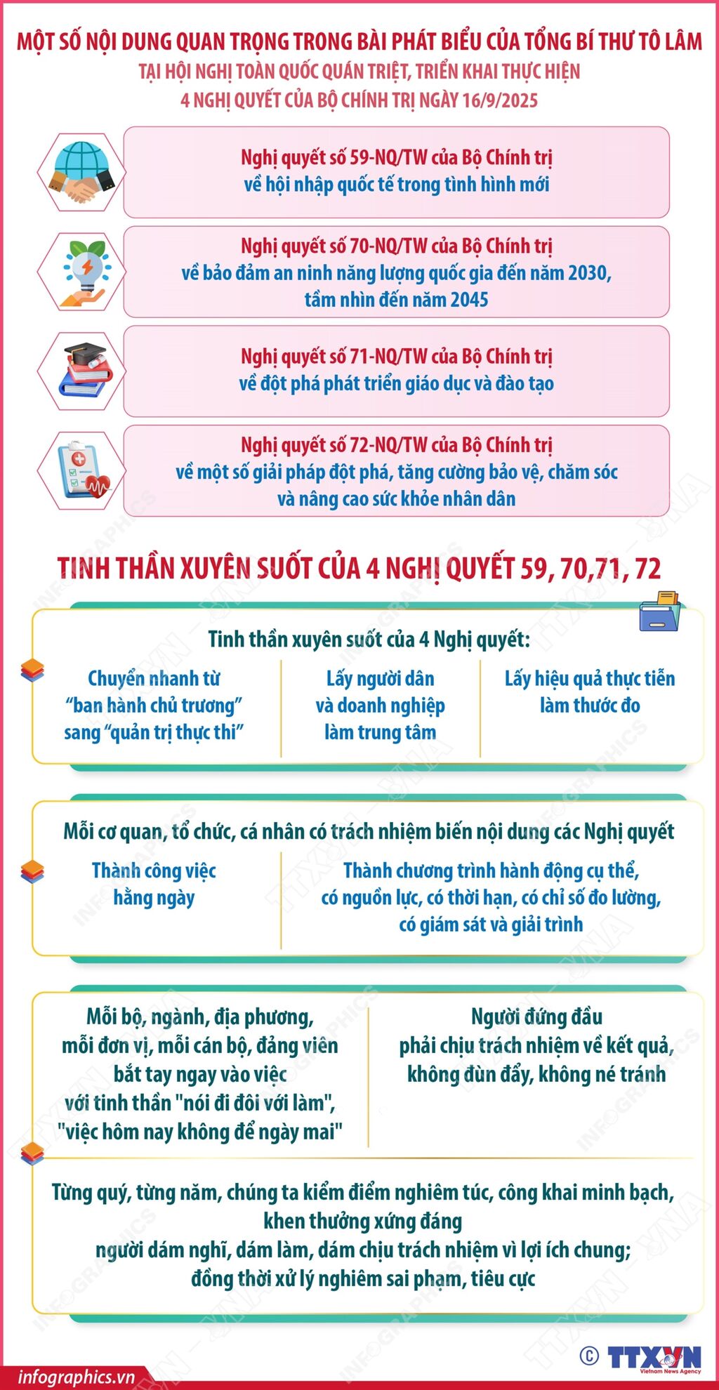 Ngày 16/9/2025, tại Hà Nội, Bộ Chính trị, Ban Bí thư tổ chức Hội nghị toàn quốc quán triệt, triển khai thực hiện 4 Nghị quyết của Bộ Chính trị về hội nhập quốc tế, an ninh năng lượng quốc gia, đột phát phát triển giáo dục và đào tạo và bảo vệ, chăm sóc, nâng cao sức khỏe nhân dân. Phát biểu và chỉ đạo tại Hội nghị, Tổng Bí thư Tô Lâm đề nghị toàn hệ thống chính trị quán triệt và thực hiện nghiêm một số nguyên tắc trong quá trình triển khai các Nghị quyết này, đó là: 5 nhất quán (chính trị-pháp lý-dữ liệu- phân bổ nguồn lực -truyền thông); 3 công khai (mục tiêu- tiến độ- kết quả); 3 sớm (sớm hoàn thiện thể chế- sớm khởi động dự án trọng điểm- sớm bố trí vốn) và 5 rõ (rõ việc, rõ người, rõ trách nhiệm, rõ thời gian, rõ kết quả)và triển khai ngay các nội dung Nghị quyết trong thời gian sớm nhất ở tất cả các cấp.