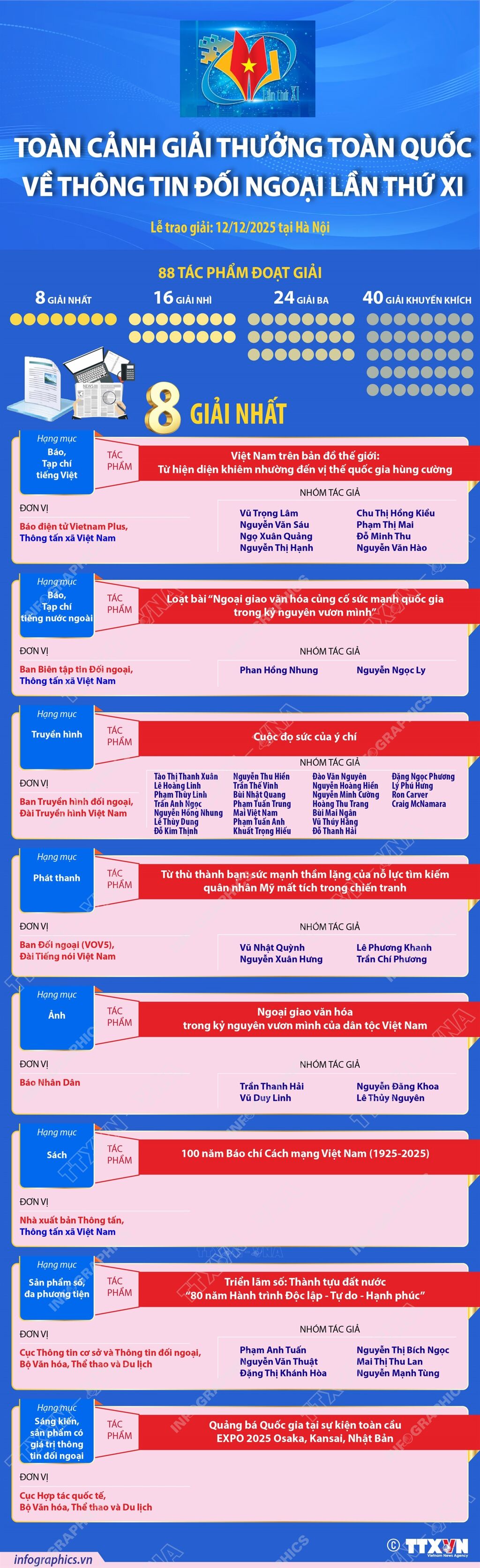 Tối 12/12/2025, Lễ trao Giải thưởng toàn quốc về thông tin đối ngoại lần thứ XI đã diễn ra tại Hà Nội. Giải thưởng thu hút 2.412 tác phẩm dự thi, gấp 2 lần số lượng trung bình của các lần tổ chức trước. Tại Lễ Trao giải, Thủ tướng Chính phủ Phạm Minh Chính và các đồng chí lãnh đạo Đảng, Nhà nước, các bộ, ban ngành thay mặt Ban Tổ chức trao 8 giải Nhất; 16 giải Nhì; 24 giải Ba và 40 giải Khuyến khích cho các tác phẩm, tác giả xuất sắc.