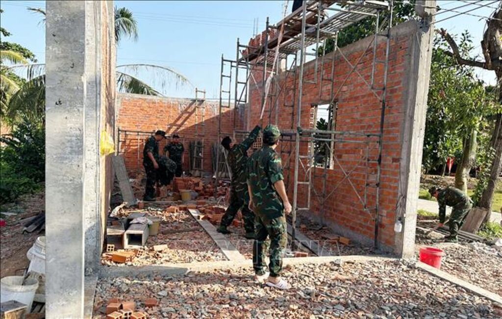 | Cán bộ, chiến sĩ Bộ Chỉ huy quân sự tỉnh Sóc Trăng tham gia giúp dân xóa nhà tạm, nhà dột nát tại thị xã Vĩnh Châu. |