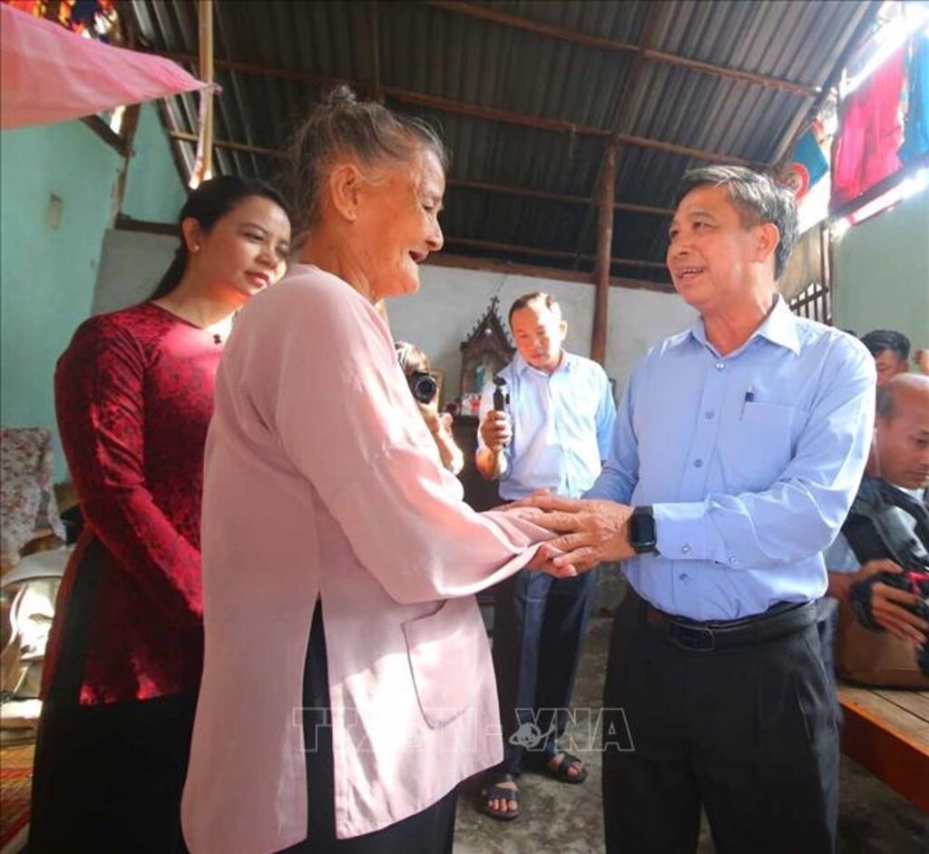 | Ông Đồng Văn Thanh, Bí thư Tỉnh ủy, Chủ tịch UBND tỉnh Hậu Giang, thăm hỏi bà Trần Thị Làng, khu vực 5, phường IV, thành phố Vị Thanh được xây nhà mới trong Chương trình “Xóa nhà tạm, nhà dột nát”. |
