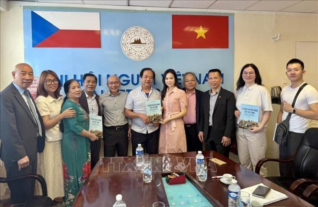 | Dịch giả Nguyễn Quyết Tiến ( thứ 6 từ trái sang) trao tặng Trung tâm bộ sách từ điển và hội thoại Việt – Séc – Anh do chính ông biên soạn, đồng thời cam kết dịch miễn phí các tác phẩm thơ tiếng Việt sang tiếng Séc để phục vụ công tác giảng dạy. Ảnh: Việt Thắng - PV TTXVN tại Séc |