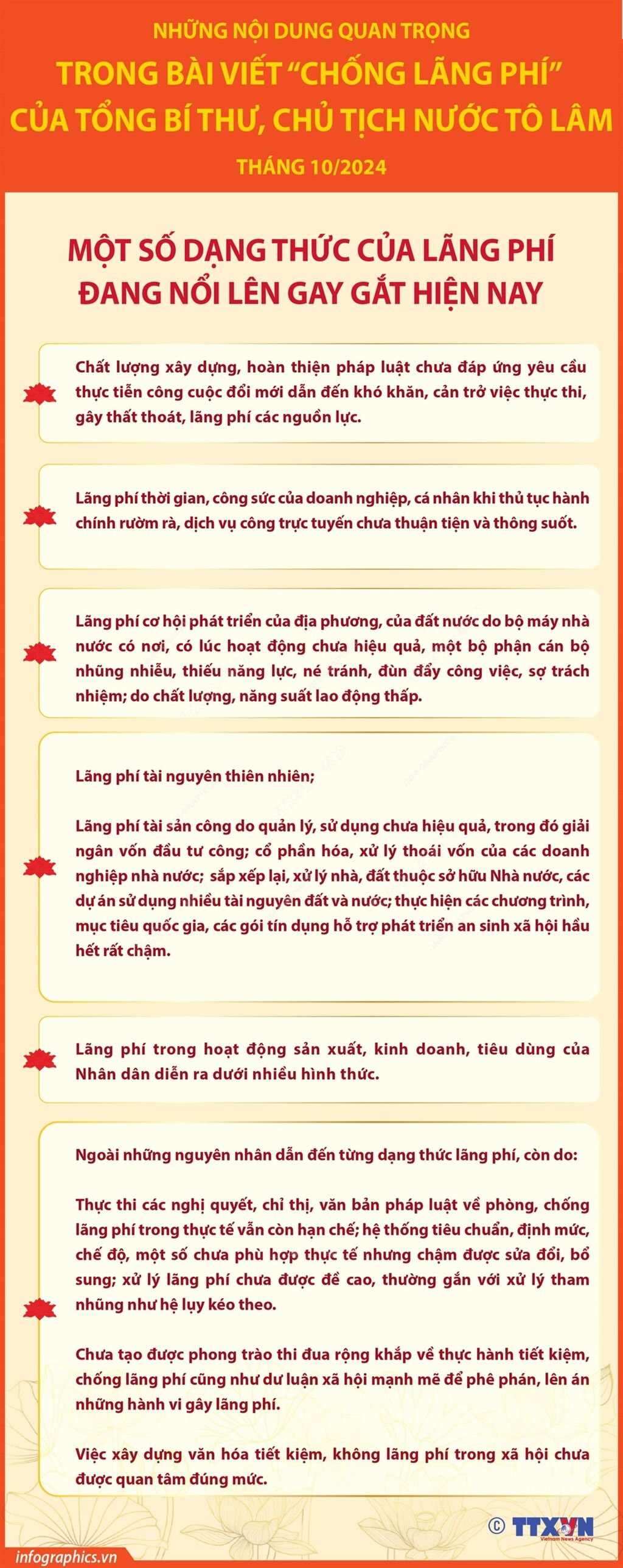 Trong bài viết “Chống lãng phí” viết tháng 10/2024, Tổng Bí thư, Chủ tịch nước Tô Lâm khẳng định: Để nắm bắt cơ hội, đẩy lùi thách thức, gia tăng mạnh mẽ nguồn lực chăm lo cho nhân dân, làm giàu cho đất nước trong giai đoạn cách mạng mới, xây dựng tương lai tốt đẹp, công tác phòng, chống lãng phí cần được triển khai quyết liệt, đồng bộ với những giải pháp hữu hiệu, tạo sự lan tỏa mạnh mẽ, trở thành tự nguyện, tự giác của mỗi cán bộ, đảng viên và người dân, văn hóa ứng xử trong thời đại mới; chú trọng một số giải pháp trọng tâm.