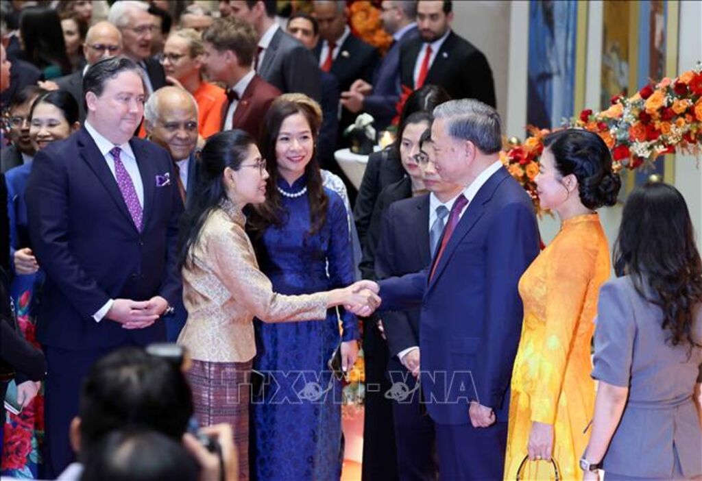| Tổng Bí thư, Chủ tịch nước Tô Lâm và Phu nhân đón các đại sứ, đại biện, trưởng đại diện các tổ chức quốc tế đến dự. |