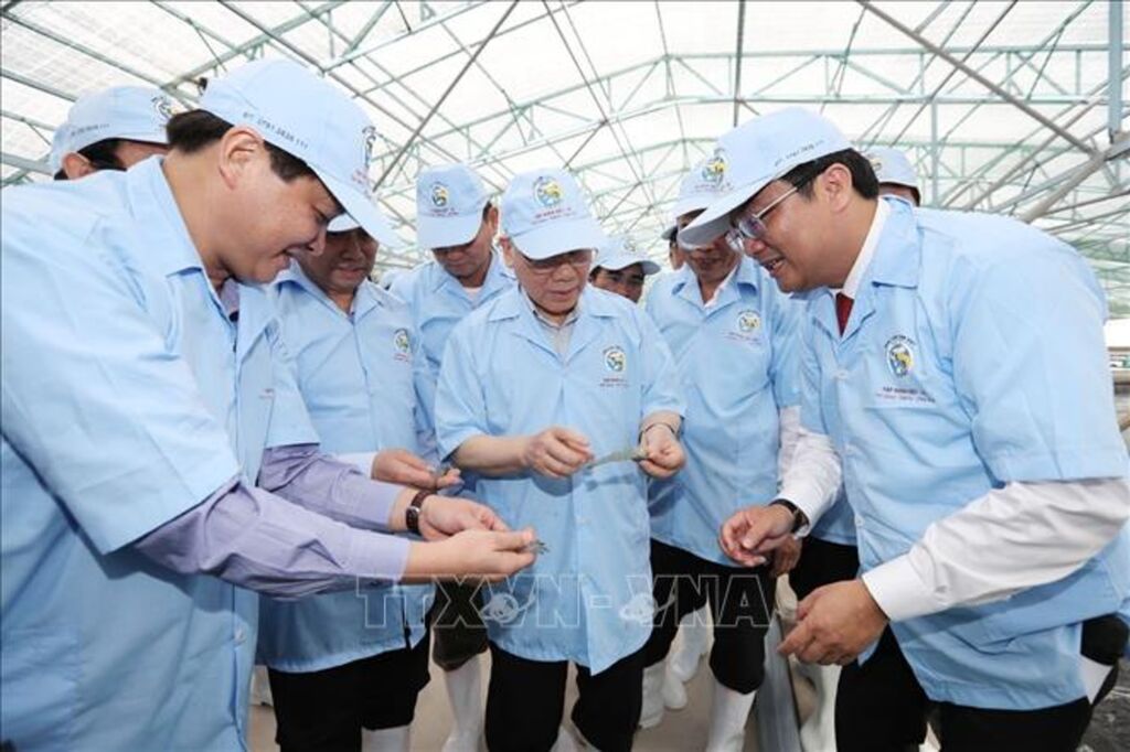 | Tổng Bí thư Nguyễn Phú Trọng thăm mô hình nuôi tôm siêu thâm canh trong khu nhà kính của Công ty Cổ phần Việt Úc - Bạc Liêu ở xã Vĩnh Thịnh, huyện Hòa Bình, tỉnh Bạc Liêu (2/2017). |