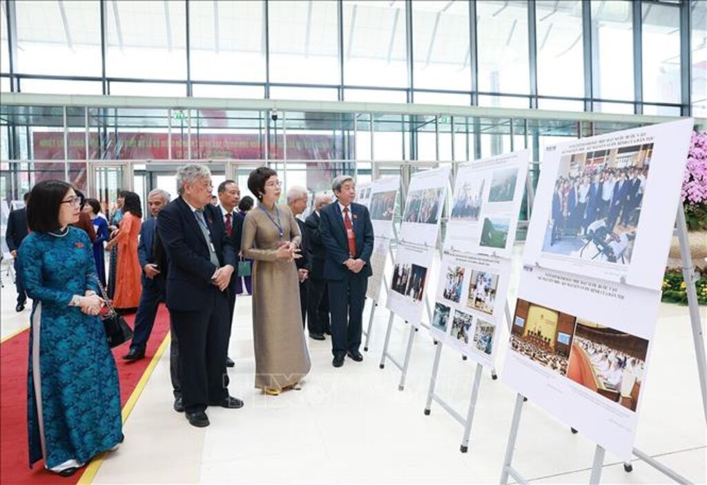 | Tổng Giám đốc TTXVN Vũ Việt Trang giới thiệu với các đại biểu trưng bày ảnh với chủ đề “Dưới ngọn cờ Đảng, 80 năm Chính phủ phụng sự Tổ quốc, phục vụ Nhân dân” do TTXVN thực hiện. |
