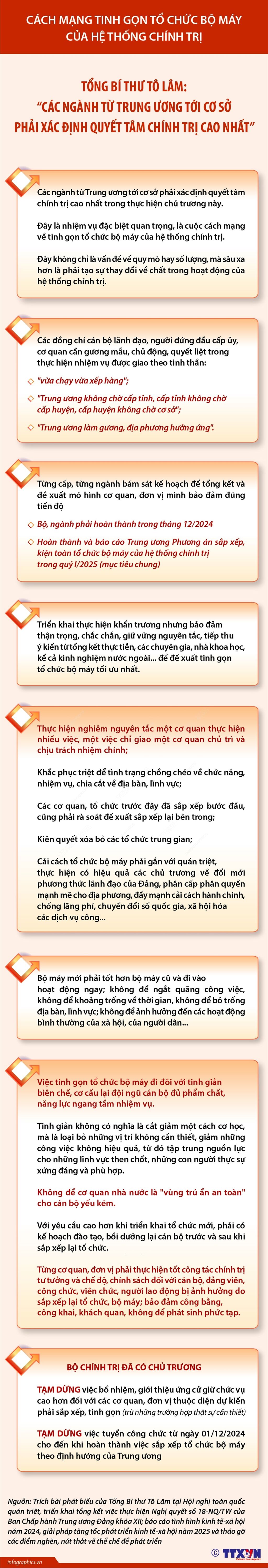 Phát biểu tại Hội nghị toàn quốc quán triệt, triển khai tổng kết việc thực hiện Nghị quyết số 18 và một số nội dung quan trọng, Tổng Bí thư Tô Lâm khẳng định: Cách mạng tinh gọn tổ chức bộ máy của hệ thống chính trị là vấn đề rất cấp bách, bắt buộc phải làm, càng làm sớm càng có lợi cho dân, cho nước vì đã nhiều Đại hội của Đảng từ các nhiệm kỳ trước từng đặt ra vấn đề này, đặc biệt là từ Đại hội XII đến nay. Điều đó cho thấy Đảng đã nhìn ra và thấy cần phải thực hiện nhưng quá trình triển khai chưa đạt mục tiêu đề ra. Đây thực sự là vấn đề khó, thậm chí rất khó vì khi tiến hành tinh gọn bộ máy sẽ liên quan đến tâm tư, tình cảm, nguyện vọng và đụng chạm tới lợi ích của một số cá nhân, tổ chức. Do vậy dù đã được chuẩn bị kỹ, bài bản và nhiều hướng dẫn thực hiện công tác này đã được gửi tới các đồng chí nhưng chắc chắn việc triển khai tại nhiều đơn vị sẽ gặp khó khăn, thậm chí sẽ có cả những lực cản. Tuy nhiên, chúng ta vẫn phải tiến hành vì muốn có một cơ thể khỏe mạnh, đôi khi chúng ta phải "uống thuốc đắng", phải chịu đau để "phẫu thuật khối u".