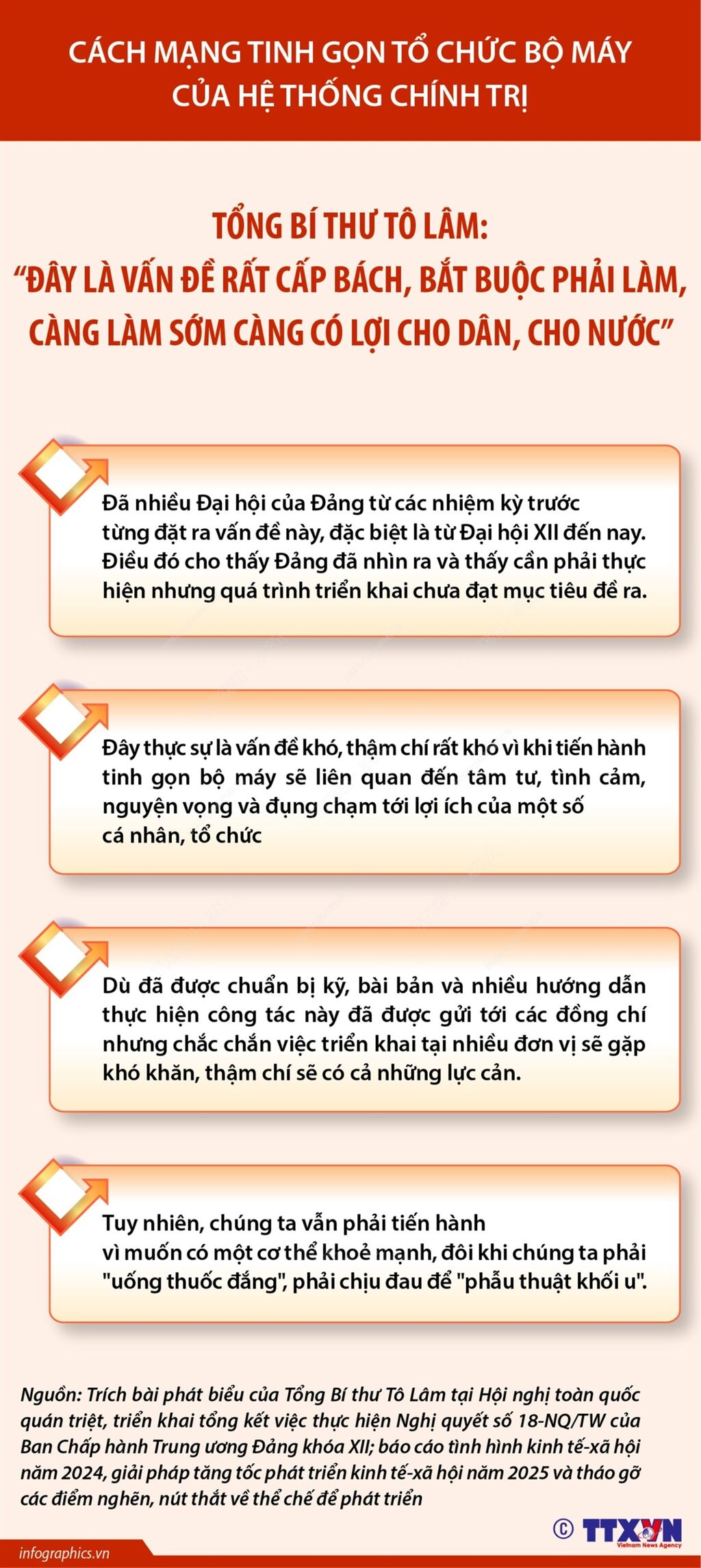 Phát biểu tại Hội nghị toàn quốc quán triệt, triển khai tổng kết việc thực hiện Nghị quyết số 18 và một số nội dung quan trọng, Tổng Bí thư Tô Lâm khẳng định: Cách mạng tinh gọn tổ chức bộ máy của hệ thống chính trị là vấn đề rất cấp bách, bắt buộc phải làm, càng làm sớm càng có lợi cho dân, cho nước vì đã nhiều Đại hội của Đảng từ các nhiệm kỳ trước từng đặt ra vấn đề này, đặc biệt là từ Đại hội XII đến nay. Điều đó cho thấy Đảng đã nhìn ra và thấy cần phải thực hiện nhưng quá trình triển khai chưa đạt mục tiêu đề ra. Đây thực sự là vấn đề khó, thậm chí rất khó vì khi tiến hành tinh gọn bộ máy sẽ liên quan đến tâm tư, tình cảm, nguyện vọng và đụng chạm tới lợi ích của một số cá nhân, tổ chức. Do vậy dù đã được chuẩn bị kỹ, bài bản và nhiều hướng dẫn thực hiện công tác này đã được gửi tới các đồng chí nhưng chắc chắn việc triển khai tại nhiều đơn vị sẽ gặp khó khăn, thậm chí sẽ có cả những lực cản. Tuy nhiên, chúng ta vẫn phải tiến hành vì muốn có một cơ thể khỏe mạnh, đôi khi chúng ta phải "uống thuốc đắng", phải chịu đau để "phẫu thuật khối u".