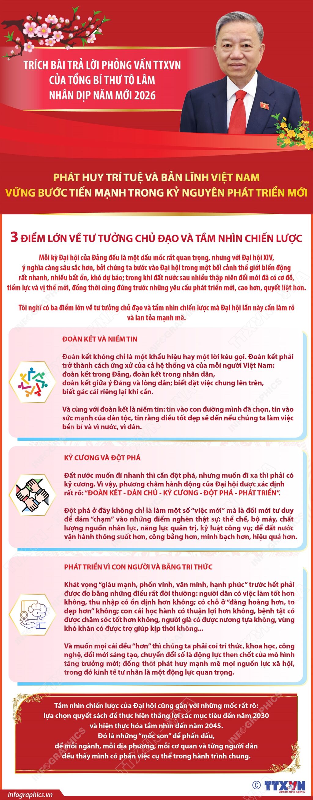 Trong bài trả lời phỏng vấn TTXVN Tết 2026, Tổng Bí thư Tô Lâm nêu 3 điểm lớn về tư tưởng chủ đạo và tầm nhìn chiến lược mà Đại hội XIV cần làm rõ và lan tỏa mạnh mẽ, đó là: đoàn kết và niềm tin, kỷ cương và đột phá, phát triển vì con người và bằng tri thức. Tổng Bí thư nêu rõ: Tầm nhìn chiến lược của Đại hội cũng gắn với những mốc rất rõ: lựa chọn quyết sách để thực hiện thắng lợi các mục tiêu đến năm 2030 và hiện thực hóa tầm nhìn đến năm 2045. Đó là những “mốc son” để phấn đấu, để mỗi ngành, mỗi địa phương, mỗi cơ quan và từng người dân đều thấy mình có phần việc cụ thể trong hành trình chung.