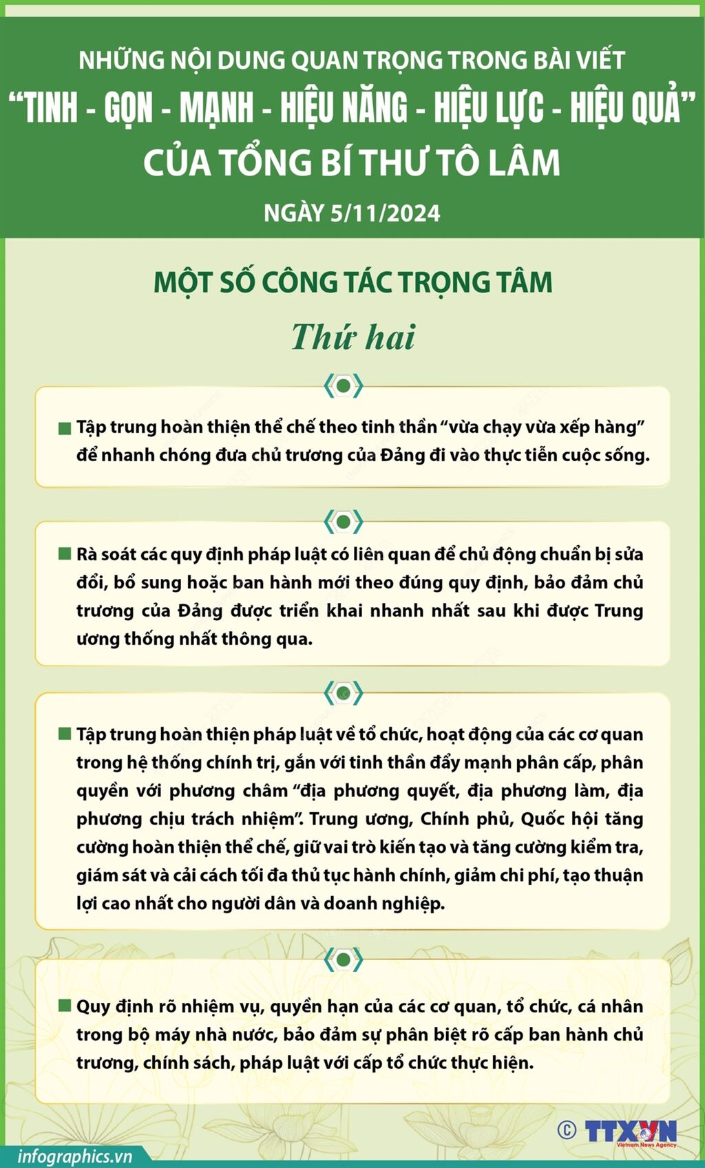 Trong bài viết "TINH - GỌN - MẠNH - HIỆU NĂNG - HIỆU LỰC - HIỆU QUẢ" ngày 5/11/2024, Tổng Bí thư Tô Lâm chỉ rõ: Thời điểm 100 năm đất nước ta dưới sự lãnh đạo Đảng và 100 năm thành lập nước không còn xa, để đạt được các mục tiêu chiến lược, không chỉ đòi hỏi những nỗ lực phi thường, những cố gắng vượt bậc, mà còn không cho phép chúng ta chậm trễ, lơi lỏng, thiếu chính xác, thiếu đồng bộ, thiếu nhịp nhàng trên từng bước đi; muốn vậy cần khẩn trương thực hiện cách mạng về tinh gọn tổ chức bộ máy của hệ thống chính trị, với một số công tác trọng tâm.