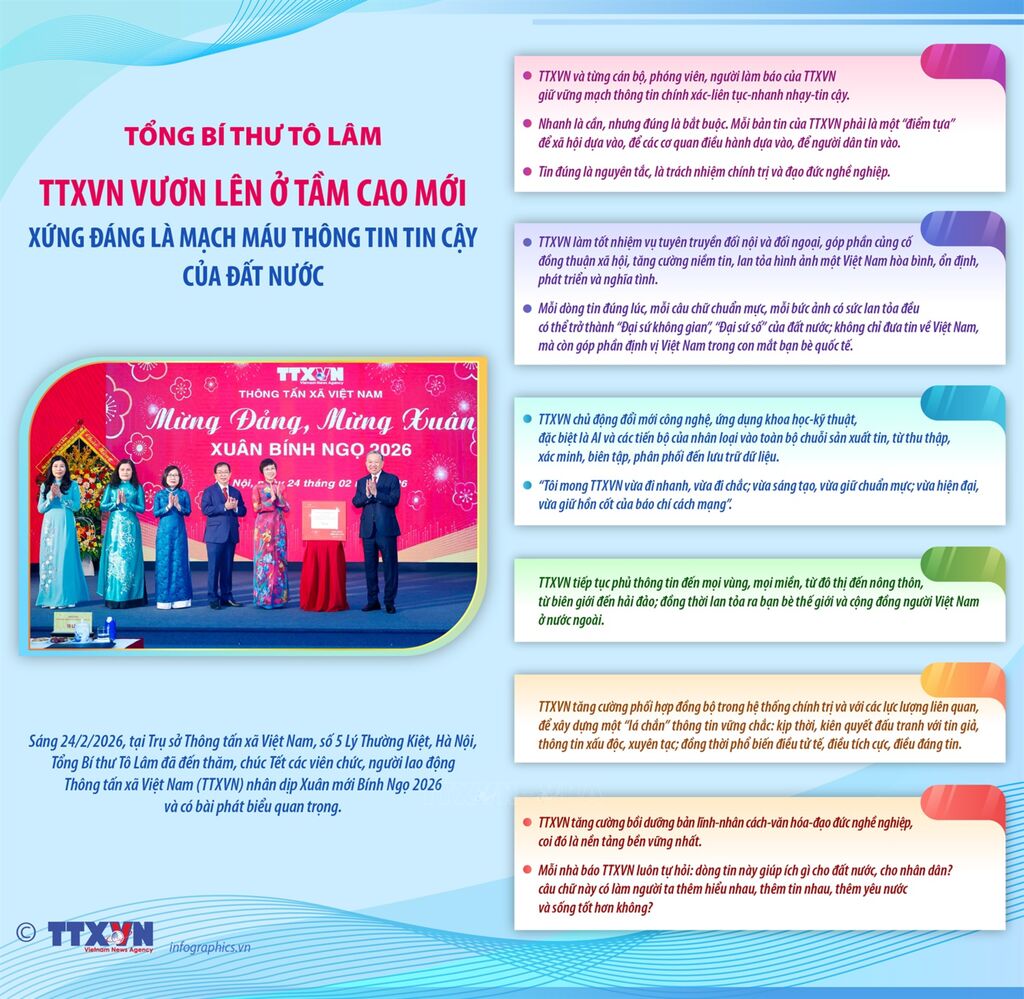 Trong không khí phấn khởi mừng Đảng, mừng Xuân Bính Ngọ, với niềm tin và khí thế mới, sáng 24/2/2026, tại Trụ sở Thông tấn xã Việt Nam, số 5 Lý Thường Kiệt, Hà Nội, Tổng Bí thư Tô Lâm đã đến thăm, chúc Tết các viên chức, người lao động Thông tấn xã Việt Nam (TTXVN) nhân dịp Xuân mới Bính Ngọ 2026. Phát biểu tại buổi đến thăm và chúc mừng cán bộ, phóng viên, người lao động Thông tấn xã Việt Nam trong những ngày đầu xuân mới, Tổng Bí thư Tô Lâm mong muốn, Thông tấn xã Việt Nam và từng cán bộ, phóng viên, người làm báo của Thông tấn xã Việt Nam giữ vững mạch thông tin chính xác-liên tục-nhanh nhạy-tin cậy. Nhanh là cần, nhưng đúng là bắt buộc. Mỗi bản tin của Thông tấn xã Việt Nam phải là một “điểm tựa” để xã hội dựa vào, để các cơ quan điều hành dựa vào, để người dân tin vào. Tin đúng là nguyên tắc, là trách nhiệm chính trị và đạo đức nghề nghiệp…
