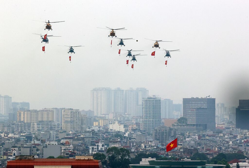 Mở đầu tổng duyệt diễu binh, diễu hành là các Biên đội của Không quân nhân dân Việt Nam anh hùng bay trên bầu trời Tổ quốc. Dẫn đầu là biên đội trực thăng Mi-171, Mi-17, Mi-8, mang theo cờ Đảng, cờ Tổ quốc tung bay trên Quảng trường Ba Đình lịch sử, biểu tượng cho sức mạnh đại đoàn kết, niềm tự hào của Đảng và dân tộc, thể hiện bản lĩnh, trí tuệ, khát vọng xây dựng đất nước cất cánh, vươn cao trong kỷ nguyên mới. Tiếp đó, đội hình máy bay vận tải Casa C-295 và C212i - những “chiến binh thầm lặng”, đảm nhiệm hiệp đồng chiến đấu, trinh sát, vận chuyển, tìm kiếm cứu nạn. Góp mặt trong khối bay chào mừng còn có Yak-130, L-39NG và Su-30MK2.