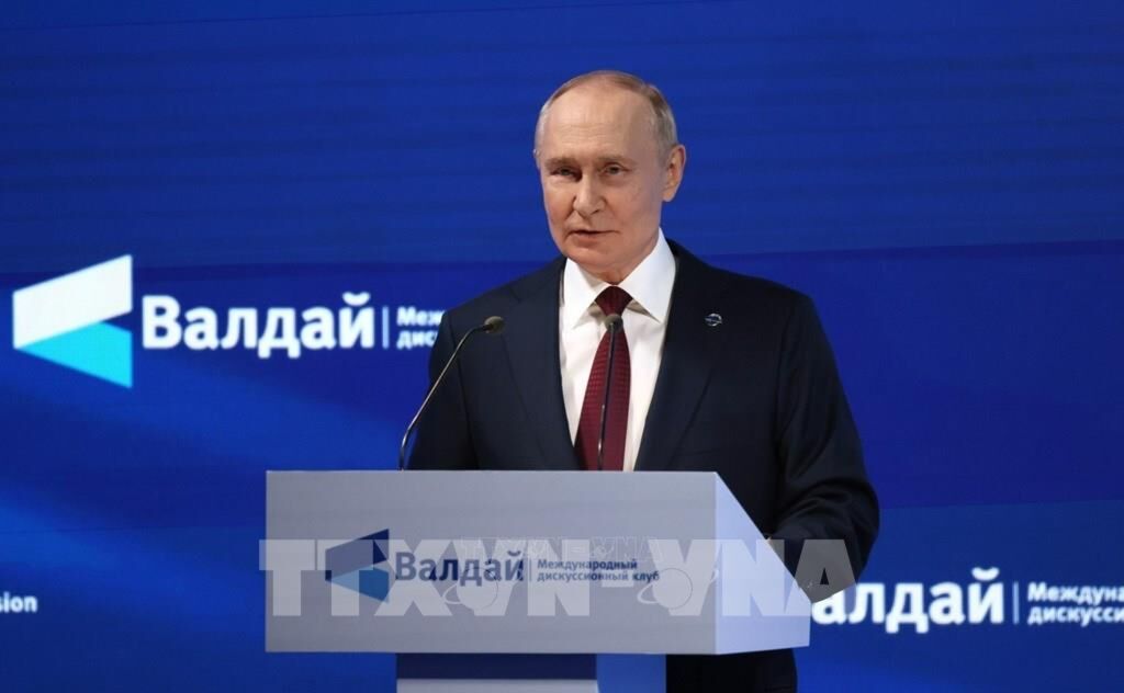 | Tổng thống Nga Vladimir Putin phát biểu về tình hình Gaza tại một sự kiện ở Sochi ngày 2/10/2025. Ảnh: AA/TTXVN |