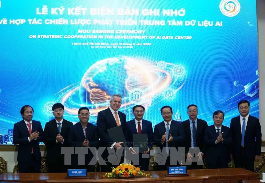 | Lãnh đạo Sở Khoa học và Công nghệ TP. Hồ Chí Minh và Công ty Accelerated Infrastructure Capital (AIC) ký kết Biên bản ghi nhớ hợp tác về đầu tư Trung tâm Dữ liệu Trí tuệ nhân tạo (AI Data Center) tại Khu công nghiệp Tân Phú Trung. Ảnh: Thu Hoài - TTXVN |
