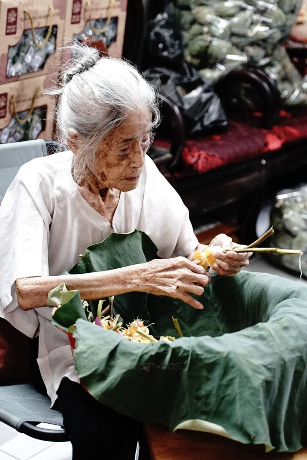 Được mệnh danh là “thiên cổ đệ nhất trà”, trà ướp sen Tây Hồ - một đặc sản trong ẩm thực Hà Nội là sự hòa quyện tuyệt vời giữa cái ngọt tinh tế của trà xanh và hương thơm nhẹ nhàng đến tinh khiết của hoa sen Bách Diệp Hồ Tây. Tất cả các công đoạn làm trà sen Tây Hồ đều được làm thủ công, với toàn bộ nguyên vật liệu là thiên nhiên, không hóa chất, đây được xem là loại trà tinh tế nhất của Việt Nam. Trong tháng 7/2024, nghề ướp trà sen Tây Hồ sẽ được đón nhận Di sản văn hoá phi vật thể cấp quốc gia. Ảnh: Khánh Hòa – TTXVN