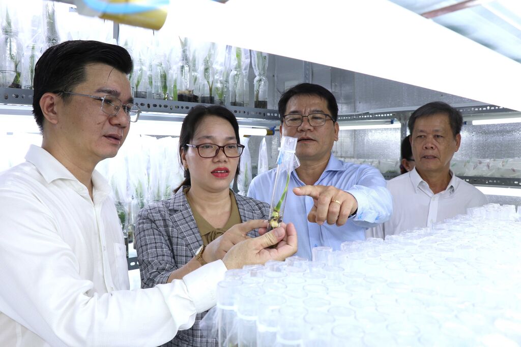 | Bí thư Tỉnh ủy Trà Vinh Ngô Chí Cường (giữa) tìm hiểu quy trình nhân giống dừa sáp bằng kỹ thuật cấy phôi. |
