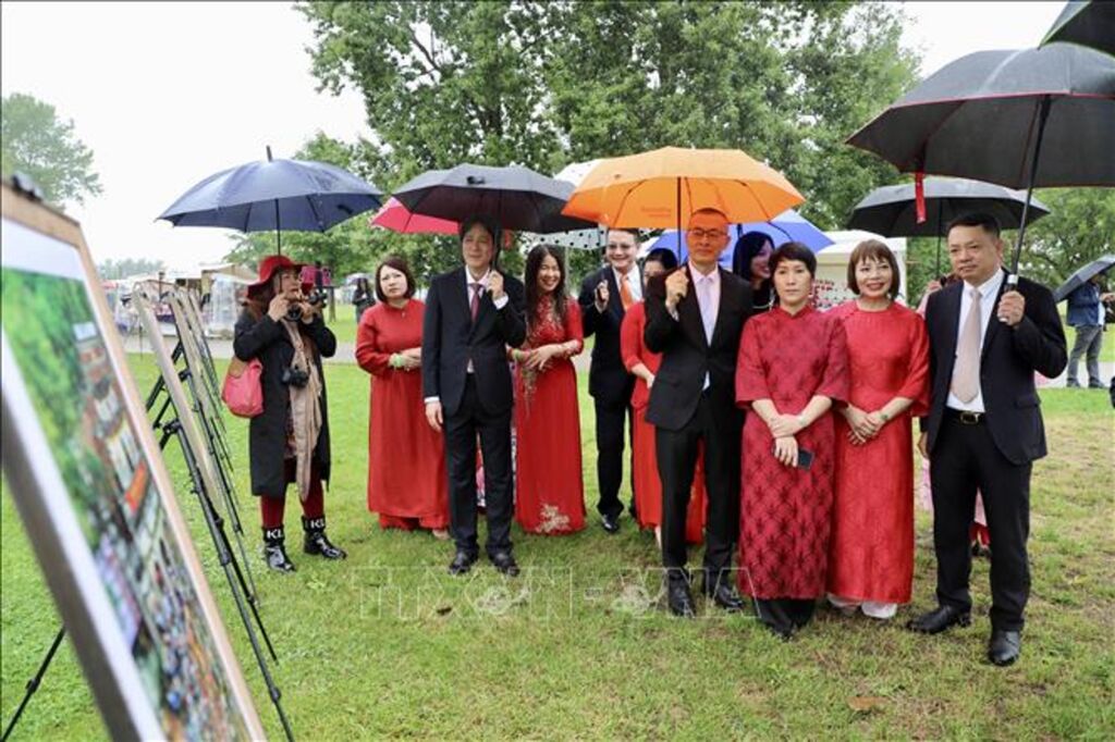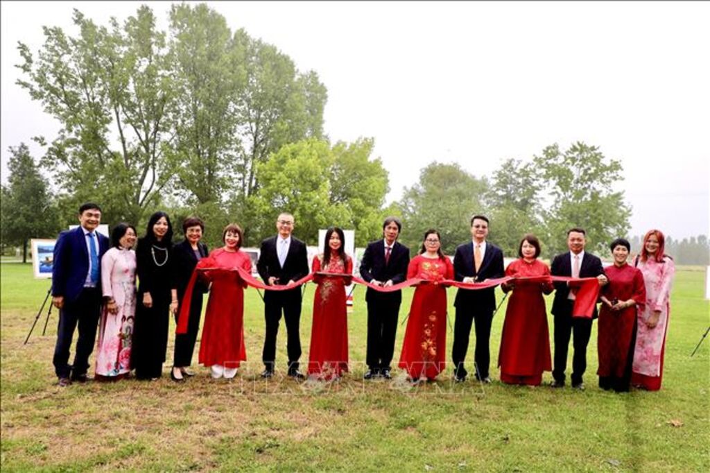 | Đại sứ Vũ Quang Minh (thứ sáu từ trái) và ông Ngô Tuấn Phong, Phó Cục trưởng Cục Mỹ thuật, Nhiếp ảnh và Triển lãm (thứ tám từ trái) tham gia cắt băng khai trương Triển lãm ảnh về Việt Nam tại Vườn Thế giới. Ảnh: Phương Hoa - PV TTXVN tại Đức |