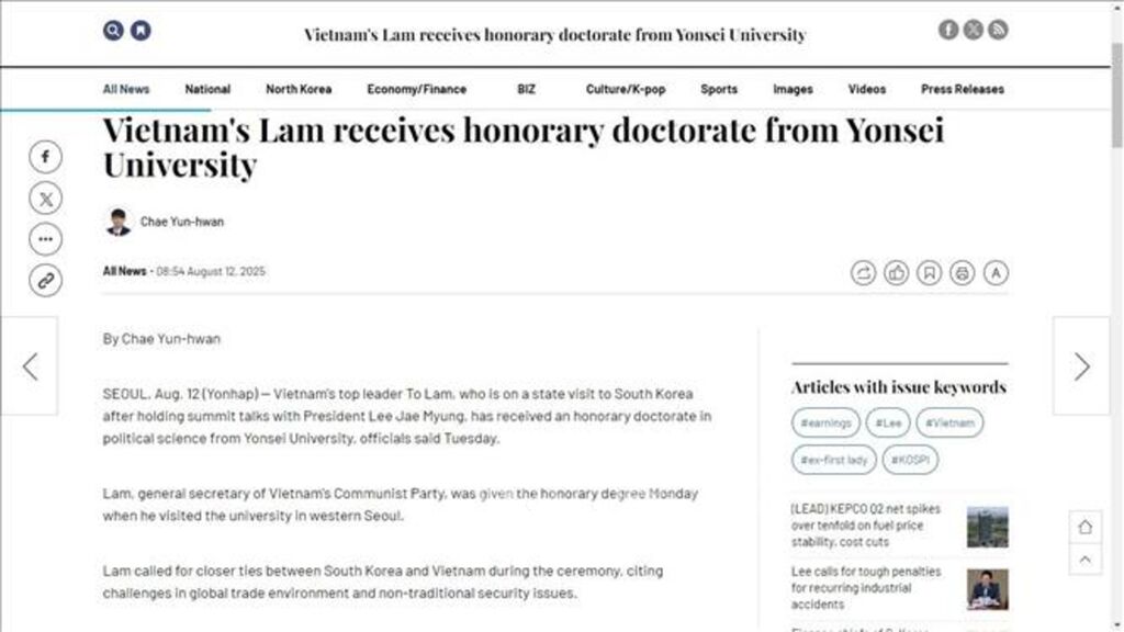 Theo hãng tin Yonhap, chuyến thăm cấp Nhà nước của Tổng Bí thư Tô Lâm là chuyến thăm đầu tiên của một nhà lãnh đạo nước ngoài đến Hàn Quốc kể từ khi Tổng thống Lee Jae Myung nhậm chức hồi tháng 6 vừa qua. Trong khuôn khổ chuyến thăm, Tổng Bí thư Tô Lâm đã tới thăm Đại học Yonsei và phát biểu chính sách tại đây. Nhân dịp này, Giáo sư Yoon Dong Sup - Hiệu trưởng Đại học Yonsei - đã trao Bằng Tiến sĩ danh dự tặng Tổng Bí thư Tô Lâm.