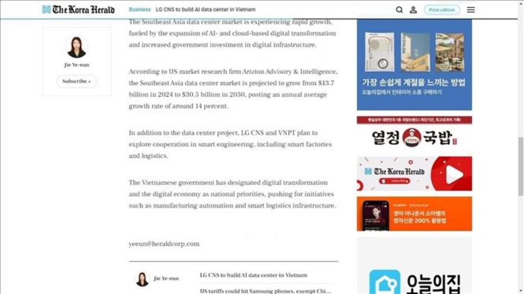Cùng ngày, trang koreaherald.com đã đăng tải bài viết, trong đó đưa đậm nét về việc Tập đoàn Bưu chính Viễn thông Việt Nam và Công ty KIRA, Công ty LG CNS hợp tác trong lĩnh vực trung tâm dữ liệu, bao gồm khả năng cùng nhau đầu tư phát triển một trung tâm dữ liệu tại Việt Nam với công suất ban đầu từ 20-30MW, cũng như cùng vận hành và kinh doanh dịch vụ trung tâm dữ liệu tại thị trường Việt Nam. Bài viết cũng nêu bật ưu tiên của Chính phủ Việt Nam trong việc đẩy mạnh chuyển đổi số và phát triển nền kinh tế số.