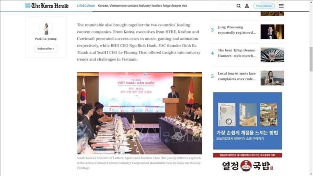 Ngoài ra, truyền thông Hàn Quốc còn đưa tin về cuộc “Tọa đàm Việt Nam – Hàn Quốc về hợp tác phát triển công nghiệp văn hóa”, do Bộ trưởng Bộ Văn hóa, Thể thao và Du lịch Việt Nam Nguyễn Văn Hùng và Bộ trưởng Bộ Văn hóa, Thể thao và Du lịch Hàn Quốc Chae Hwi Young đồng chủ trì, trong đó, các nhà quản lý, chuyên gia và doanh nghiệp hai nước đã trao đổi kinh nghiệm, chia sẻ nhu cầu hợp tác và đề xuất các chính sách hỗ trợ doanh nghiệp./.