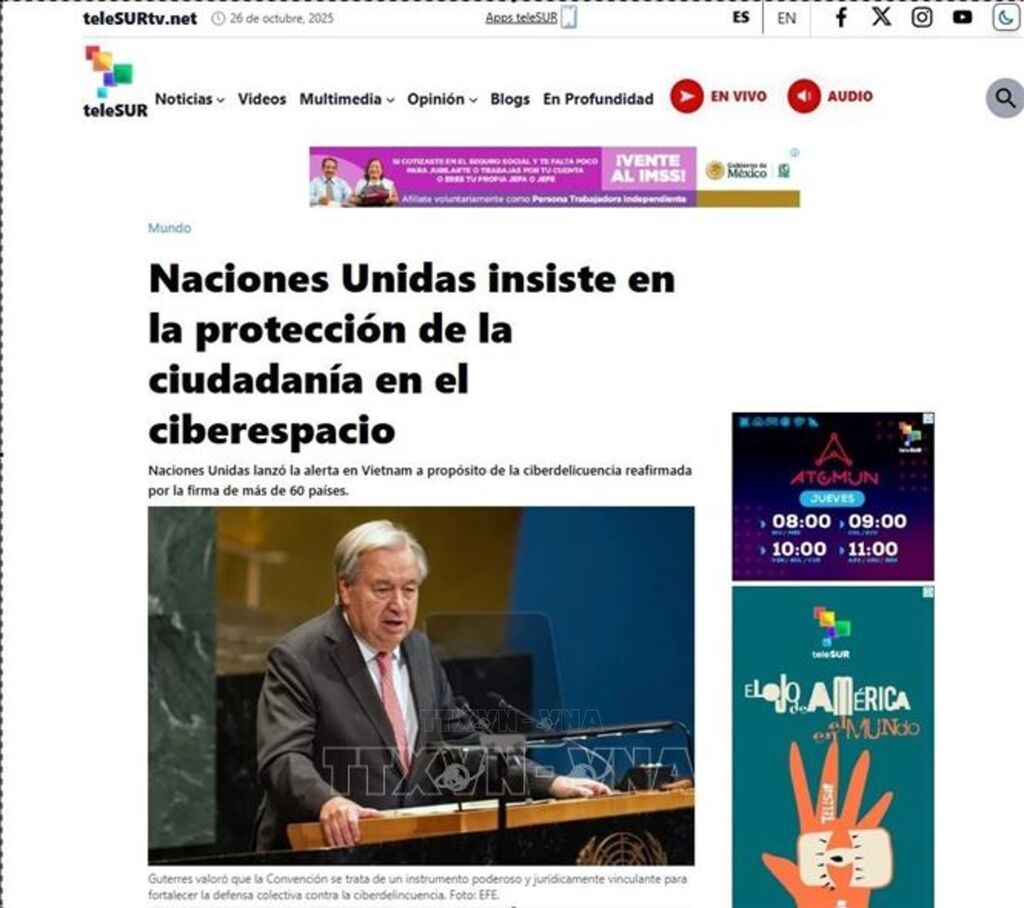Cùng lúc đó, cổng thông tin chính thức của Cơ quan Phòng, chống ma túy và tội phạm LHQ (UNODC) phiên bản tiếng Tây Ban Nha, nêu rõ lễ mở ký Công ước tại Hà Nội đã thu hút sự tham gia của đại diện hàng chục quốc gia và vùng lãnh thổ, trong đó có nhiều nước Mỹ Latinh như Brazil, Chile, Costa Rica, Peru, Ecuador, Uruguay và Venezuela. Theo UNODC, việc tổ chức sự kiện tại Việt Nam mang ý nghĩa biểu tượng của tinh thần đoàn kết quốc tế, đặt nền móng cho cơ chế hợp tác xuyên quốc gia trong thu thập chứng cứ kỹ thuật số, bảo vệ người dùng và phòng ngừa tội phạm mạng.