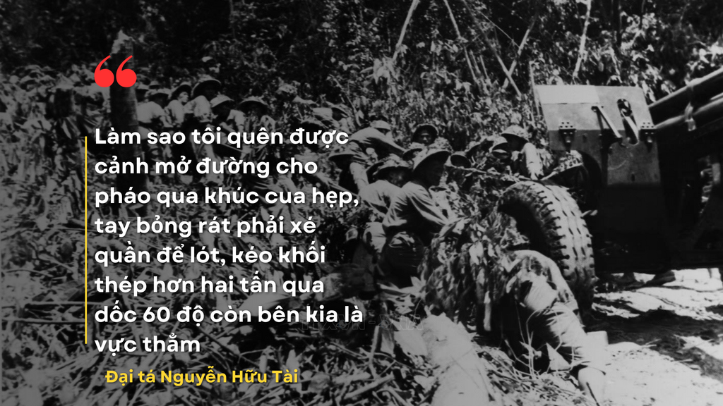 Đại tá Nguyễn Hữu Tài (96 tuổi, hiện ở phố Điện Biên Phủ, Hà Nội), nguyên Phó Cục trưởng Cục Quân huấn, Bộ Quốc phòng, là Chủ nhiệm Chính trị Trung đoàn 209, Đại đoàn 312 trong chiến dịch ấy. Ông bảo, không chỉ 56 ngày “khoét núi, ngủ hầm, mưa dầm, cơm vắt”, tính cả hành quân, kéo pháo vào - ra, đào công sự, chiến đấu… thì chiến dịch là 120 ngày. “Làm sao tôi quên được cảnh mở đường cho pháo qua khúc cua hẹp, tay bỏng rát phải xé quần để lót, kéo khối thép hơn hai tấn qua dốc 60 độ còn bên kia là vực thẳm”, ông Nguyễn Hữu Tài nhớ lại.