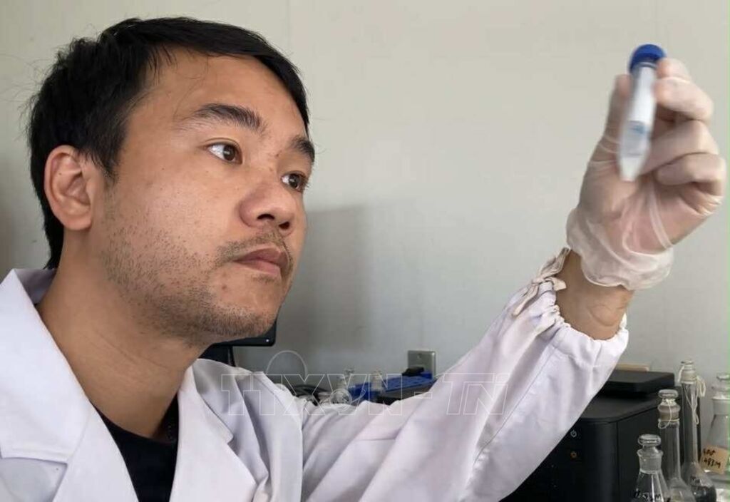 | Tiến sĩ Đinh Hùng Cường, kiều bào Nhật Bản, Trưởng phòng Nghiên cứu và Phát triển Viện hóa học nước biển Kitakyushu (Nhật Bản) thực hành nghiên cứu trong phòng thí nghiệm của đơn vị. |