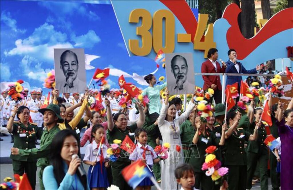 | Chương trình biểu diễn nghệ thuật của lực lượng văn nghệ sỹ TP Hồ Chí Minh tham gia tổng duyệt Lễ diễu binh, diễu hành kỷ niệm 50 năm Ngày Giải phóng miền Nam, thống nhất đất nước. Ảnh: Thanh Vũ/TTXVN |