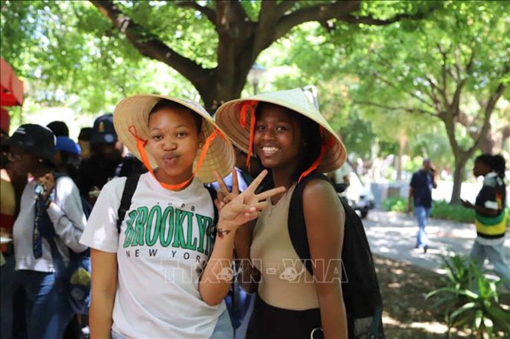 | Sinh viên quốc tế thích thú chụp ảnh cùng nón lá Việt Nam. Ảnh: Hồng Minh - PV TTXVN tại Nam Phi |