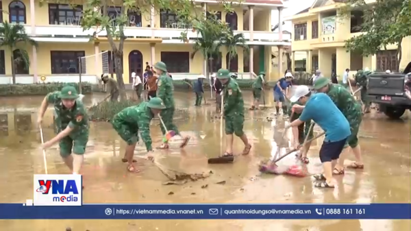 Ban Chỉ huy Bộ đội Biên phòng tỉnh Quảng Trị điều động cán bộ, chiến sĩ phối hợp cùng chính quyền địa phương vệ sinh trường lớp sau lũ, giúp học sinh sớm trở lại trường học.