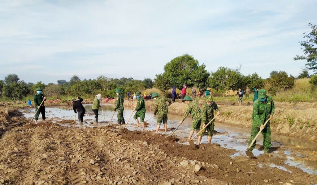 | Cán bộ, chiến sĩ Đồn biên phòng Ia Púch xuống ruộng hướng dẫn người dân đắp đập, be bờ để làm lúa nước 2 vụ. |