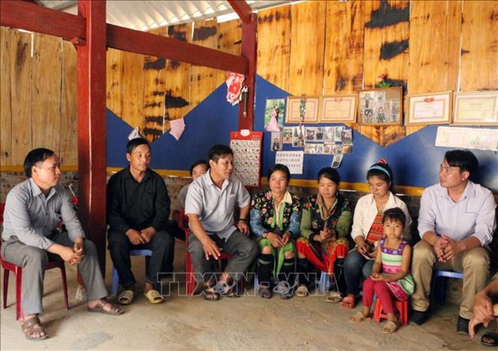 | Trưởng Ban Dân vận huyện Tân Uyên, tỉnh Lai Châu (thứ 3 bên trái) cùng cán bộ xã tuyên truyền vận động người dân bản Khau Giếng, xã Hố Mít, huyện Tân Uyên bỏ những phong tục, tập quán lạc hậu, cùng giúp nhau phát triển kinh tế, xóa đói giảm nghèo, chung tay xây dựng nông thôn mới. |