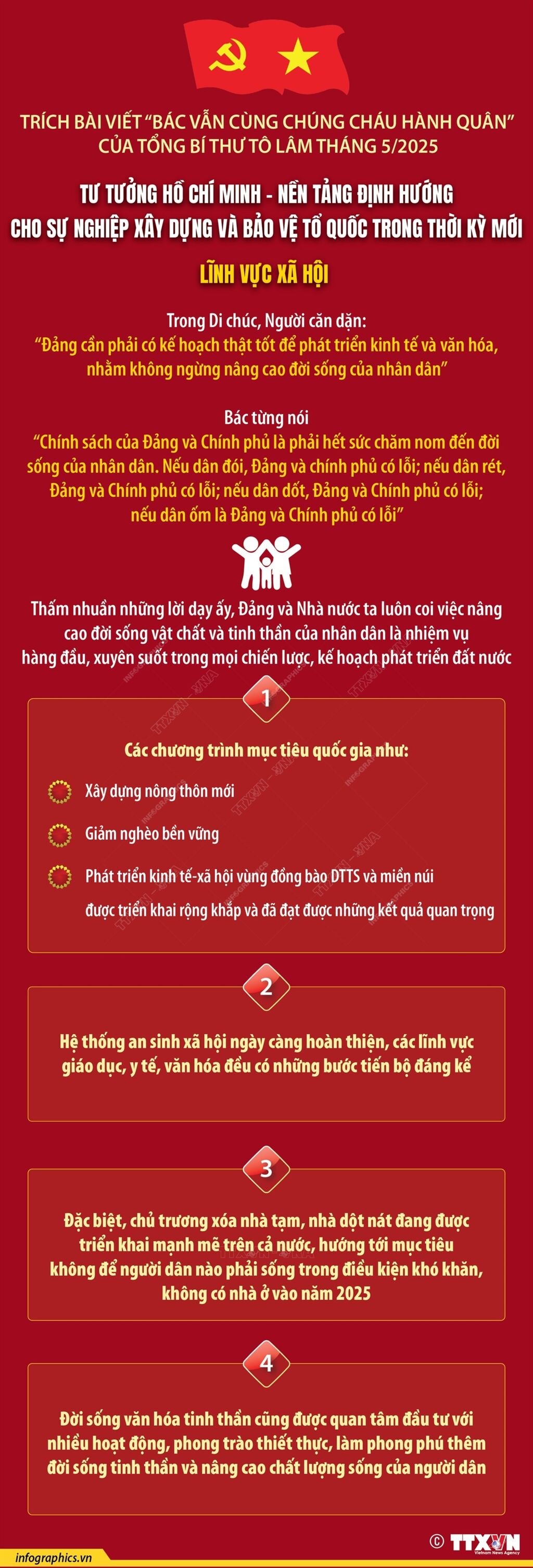 Nhân kỷ niệm 135 năm ngày sinh Chủ tịch Hồ Chí Minh (19/5/1890 - 19/5/2025), Tổng Bí thư Tô Lâm có bài viết “Bác vẫn cùng chúng cháu hành quân”. Trong bài viết, Tổng Bí thư khẳng định: Hơn nửa thế kỷ từ khi Bác đi xa, tư tưởng và tấm gương của Chủ tịch Hồ Chí Minh tiếp tục soi đường, dẫn dắt dân tộc Việt Nam gặt hái nhiều thành tựu to lớn, có ý nghĩa lịch sử. Thực tiễn gần 40 năm Đổi mới đã chứng minh rõ: Mỗi chủ trương đúng đắn của Đảng, mỗi chính sách hợp lòng dân đều phản ánh sự kế thừa và phát huy sáng tạo tư tưởng của Bác. Ngày nay, trên tất cả các lĩnh vực từ kinh tế, xã hội, giáo dục, y tế cho đến quốc phòng, an ninh và đối ngoại, chúng ta đều thấy rõ dấu ấn tư tưởng Hồ Chí Minh - nền tảng định hướng cho sự nghiệp xây dựng và bảo vệ Tổ quốc trong thời kỳ mới.