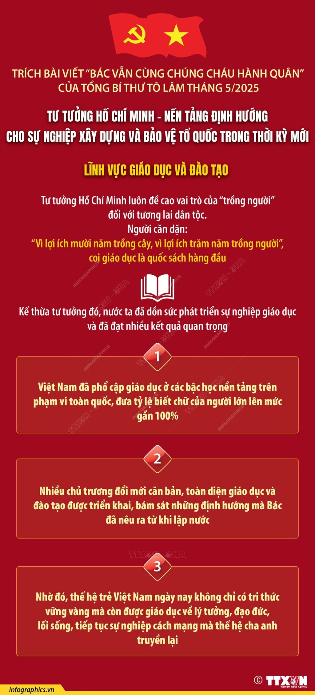 Nhân kỷ niệm 135 năm ngày sinh Chủ tịch Hồ Chí Minh (19/5/1890 - 19/5/2025), Tổng Bí thư Tô Lâm có bài viết “Bác vẫn cùng chúng cháu hành quân”. Trong bài viết, Tổng Bí thư khẳng định: Hơn nửa thế kỷ từ khi Bác đi xa, tư tưởng và tấm gương của Chủ tịch Hồ Chí Minh tiếp tục soi đường, dẫn dắt dân tộc Việt Nam gặt hái nhiều thành tựu to lớn, có ý nghĩa lịch sử. Thực tiễn gần 40 năm Đổi mới đã chứng minh rõ: Mỗi chủ trương đúng đắn của Đảng, mỗi chính sách hợp lòng dân đều phản ánh sự kế thừa và phát huy sáng tạo tư tưởng của Bác. Ngày nay, trên tất cả các lĩnh vực từ kinh tế, xã hội, giáo dục, y tế cho đến quốc phòng, an ninh và đối ngoại, chúng ta đều thấy rõ dấu ấn tư tưởng Hồ Chí Minh - nền tảng định hướng cho sự nghiệp xây dựng và bảo vệ Tổ quốc trong thời kỳ mới.