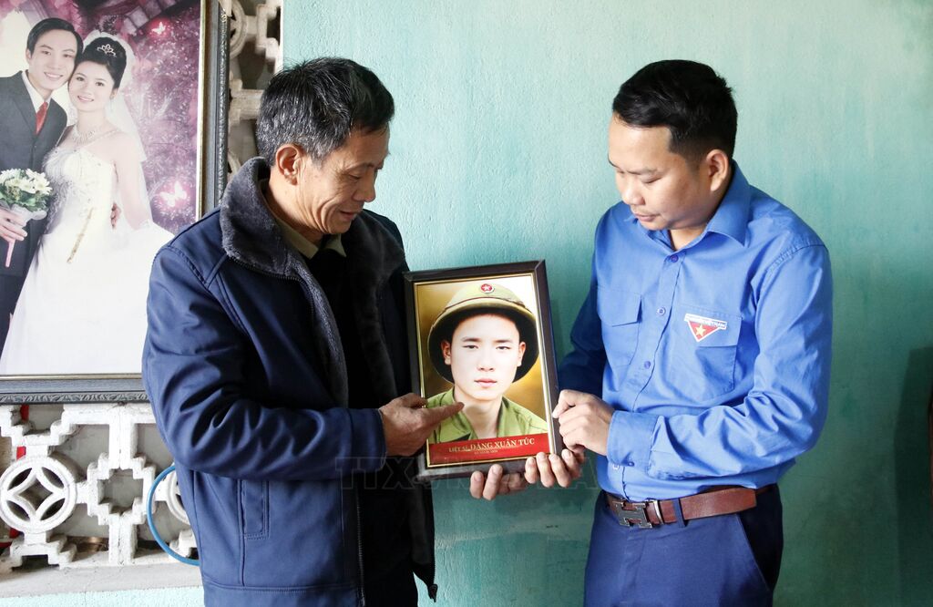 | Bí thư Đoàn Thị trấn Cao Thượng, Tân Yên, Bắc Giang Trần Văn Dũng trao di ảnh phục chế lại cho gia đình liệt sĩ Đặng Xuân Túc. |
