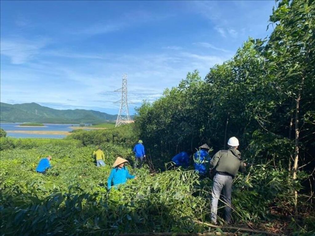 | Đoàn viên, thanh niên Hà Tĩnh hỗ trợ phát quang cây cối trên hành lang tuyến. |