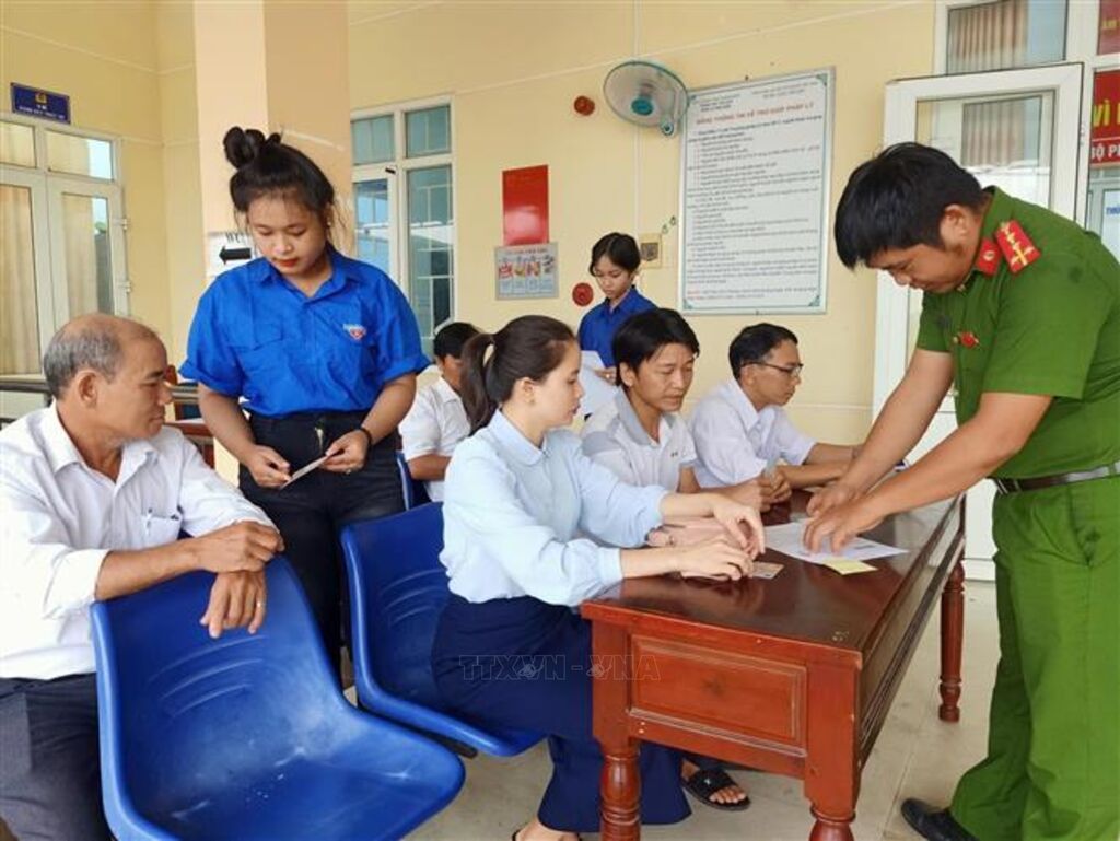 | Đoàn viên thanh niên “Đội bình dân học vụ số” xã Tu Mơ Rông phối hợp cùng Công an xã hướng dẫn người dân các thủ tục khi đổi căn cước công dân, thẻ đảng viên. |