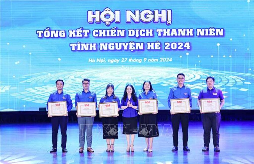 | Bí thư Thành đoàn Hà Nội Chu Hồng Minh trao bằng khen của Trung ương Đoàn TNCS Hồ Chí Minh cho các cá nhân có thành tích xuất sắc trong chiến dịch Thanh niên tình nguyện hè 2024. |
