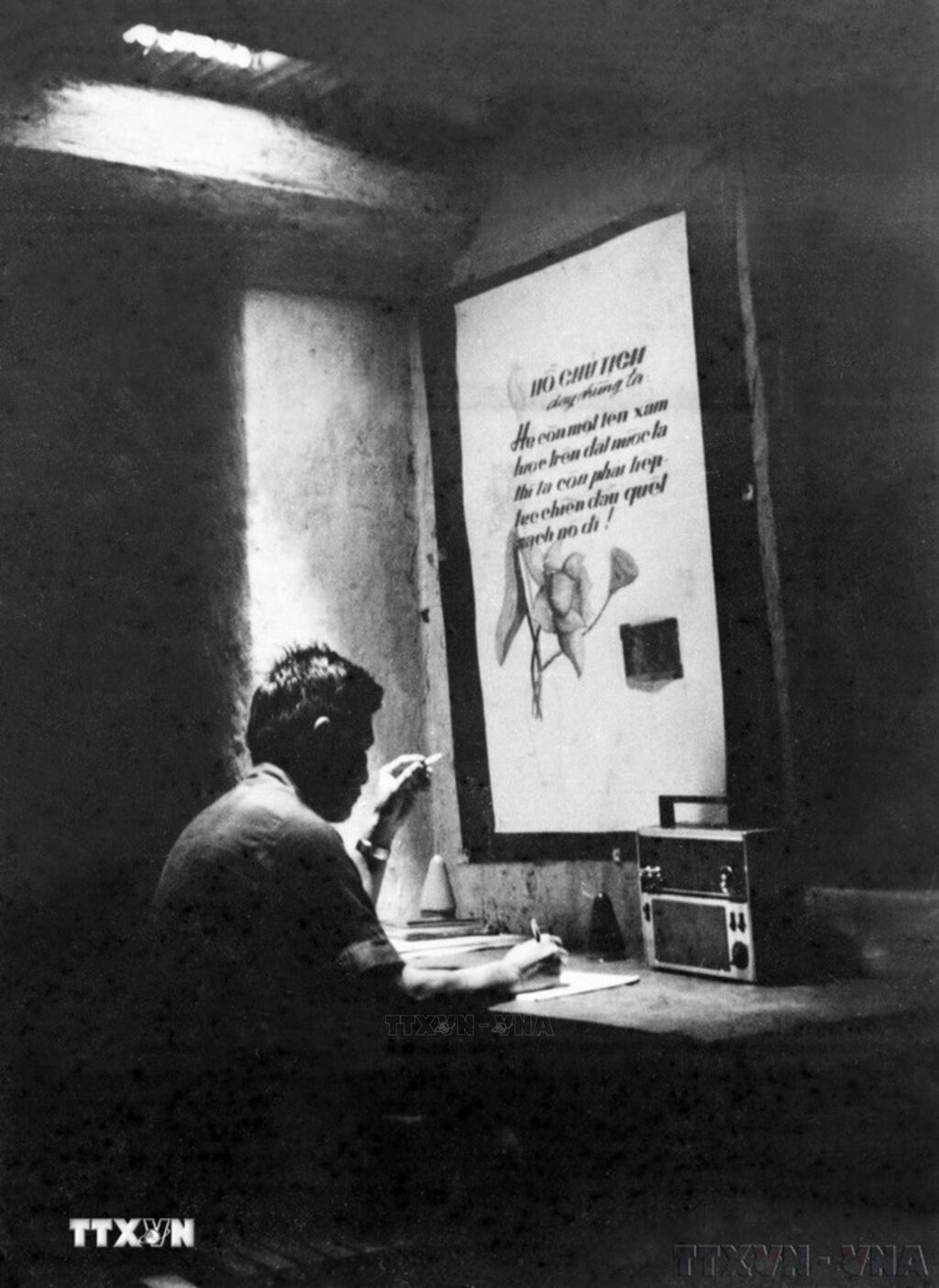 | Trong các cuộc kháng chiến thống nhất và bảo vệ Tổ quốc, đội ngũ những người làm báo của TTXVN thực sự là những nhà báo – chiến sĩ. Trong ảnh: Đồng chí Trần Trung Sơn khẩn trương đánh tin tức chiến thắng về Thông Tấn xã năm 1970. (Ảnh: TTXVN) |