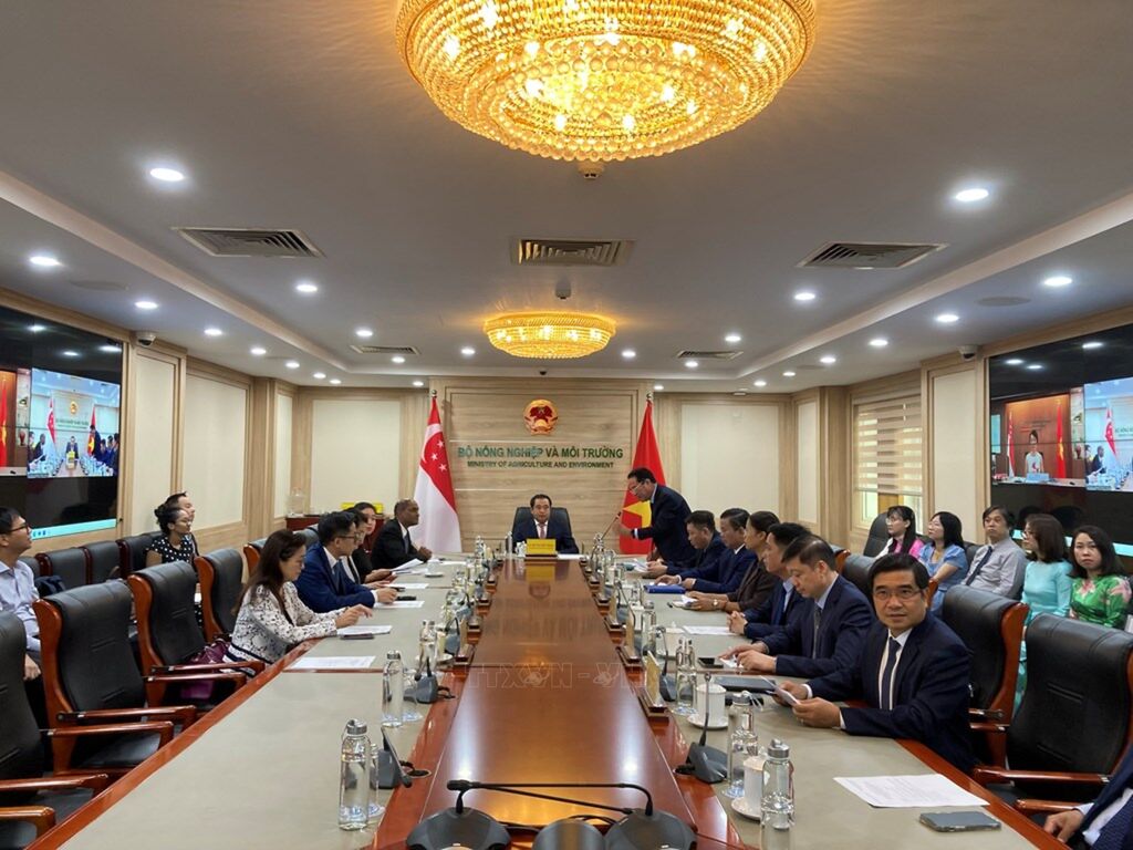 | Quang cảnh buổi ký kết thực hiện theo Điều 6 của Thỏa thuận Paris về biến đổi khí hậu giữa Việt Nam và Singapore. Ảnh: Thắng Trung/TTXVN |