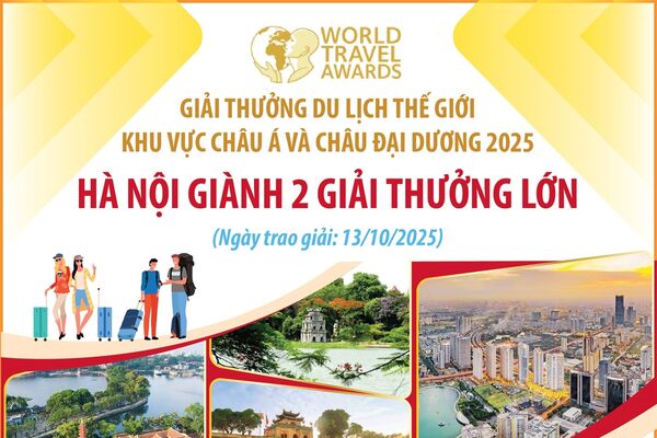 Tại lễ trao giải thưởng Du lịch Thế giới (World Travel Awards - WTA) khu vực châu Á và châu Đại Dương năm 2025 diễn ra ngày 13/10/2025 tại Khu hành chính đặc biệt Hong Kong (Trung Quốc) Thủ đô Hà Nội tiếp tục được vinh danh ở 2 hạng mục "Điểm đến thành phố hàng đầu châu Á" và "Điểm đến du lịch thành phố cho kỳ nghỉ dưỡng ngắn ngày hàng đầu châu Á".