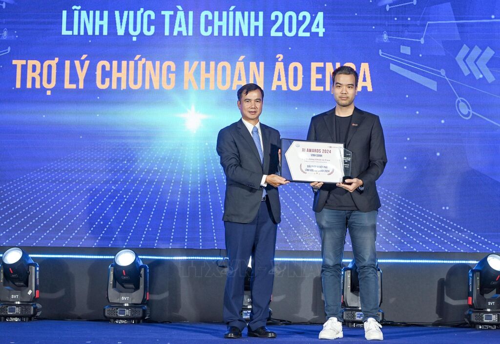 | Thứ trưởng Bộ Khoa học và Công nghệ Bùi Thế Duy trao Bằng vinh danh "Giải pháp AI đột phá lĩnh vực tài chính 2024" cho Công ty Cổ phần chứng khoán DNSE với "Trợ lý chứng khoán ảo Ensa". |