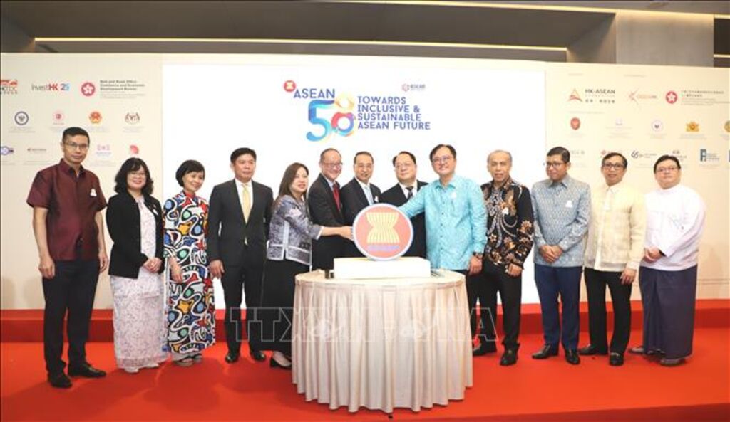 | Đại diện ban tổ chức và Lãnh sự đoàn ASEAN đã cùng cắt bánh kỷ niệm 58 năm thành lập ASEAN. Ảnh: Xuân Vịnh-Phóng viên TTXVN tại Hong Kong. |