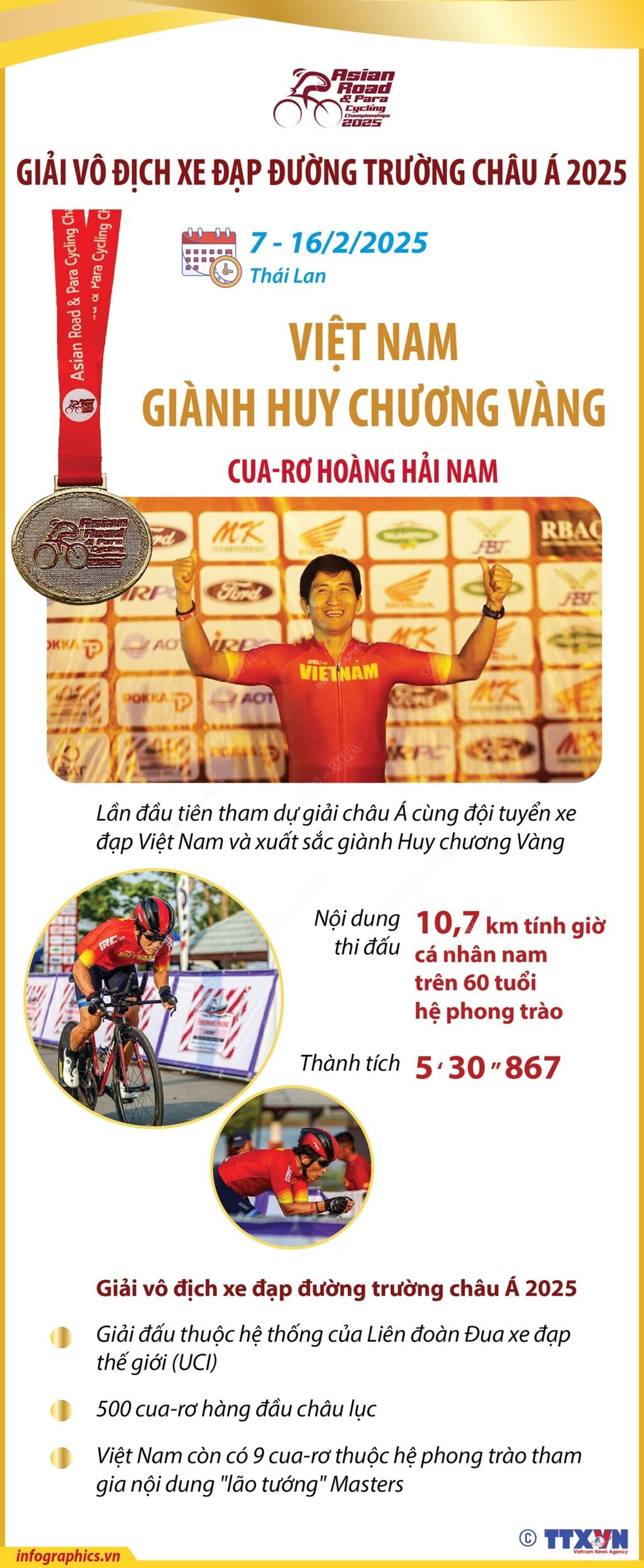 Lão tướng của làng đua xe đạp Việt Nam - Hoàng Hải Nam vừa xuất sắc giành Huy chương Vàng cự ly 10,7 km nội dung cá nhân tính giờ nam trên 60 tuổi hệ phong trào tại Giải vô địch xe đạp đường trường châu Á 2025. Đây là lần đầu tiên xe đạp phong trào Việt Nam góp mặt tại sân chơi châu lục và thành tích này đánh dấu cột mốc đáng nhớ cho nền thể thao nước nhà. Giải đua xe đạp đường trường châu Á 2025 diễn ra ở Thái Lan từ ngày 7 - 16/2/2025.